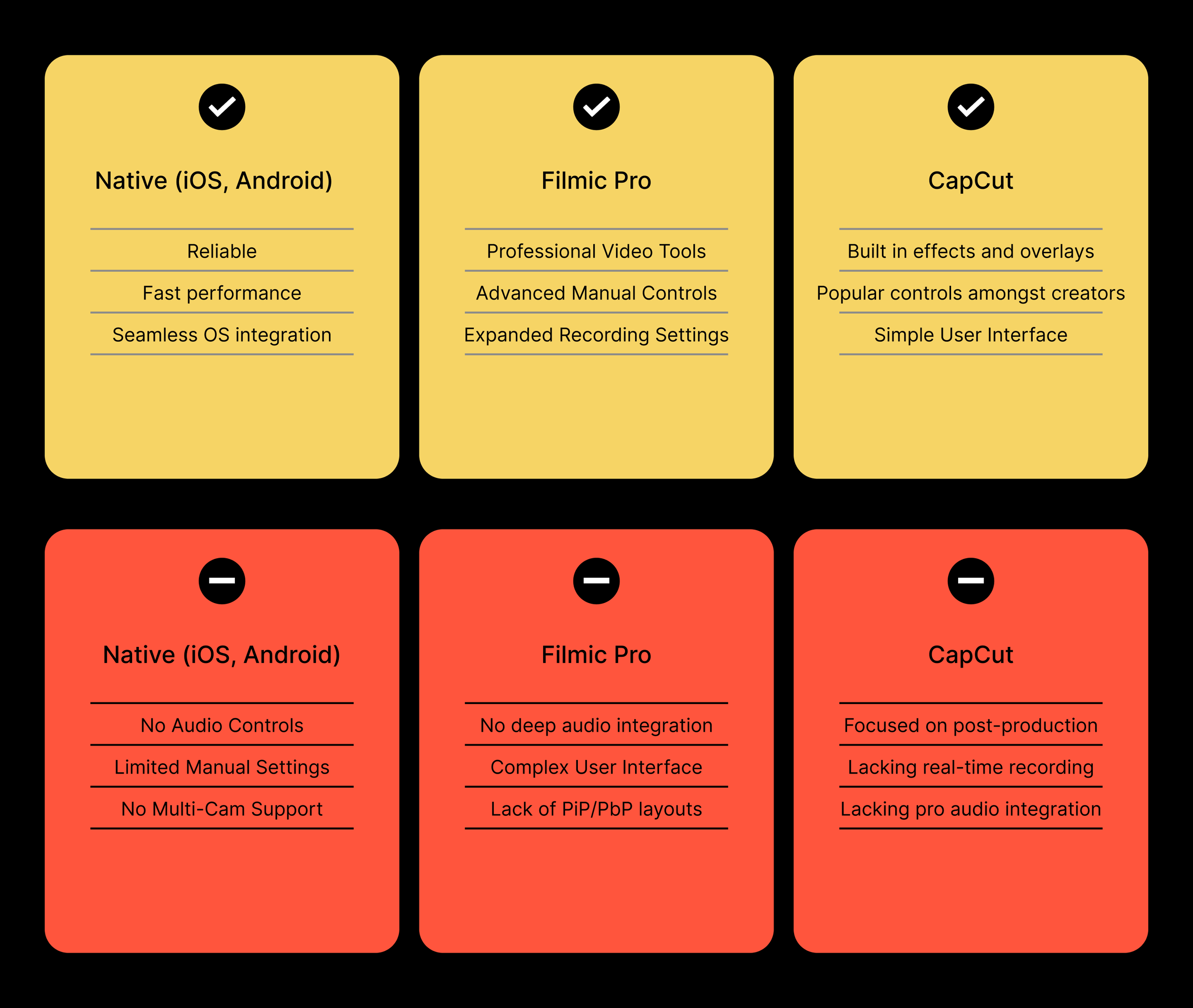 | Great audio without extra steps | Third-party apps lacked proper mic integration; required separate audio recording & syncing. | Direct microphone processing integration for best sound quality. |
