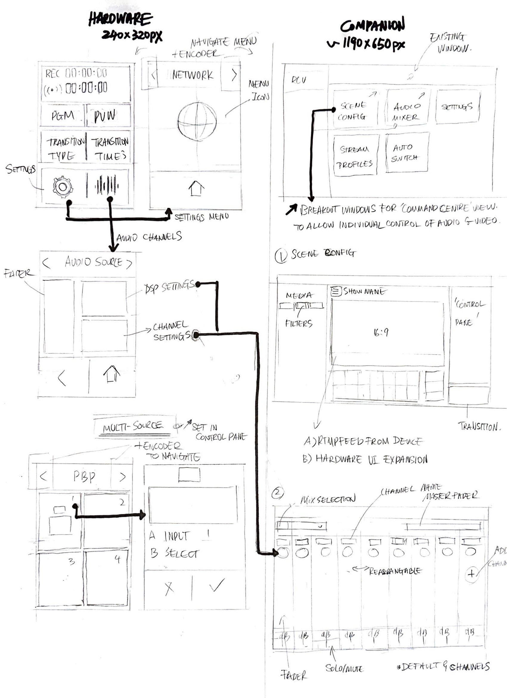 Initial sketches of the main flow of the interaction of the Hardware UI and the companion app as they needed to be thought out together.
